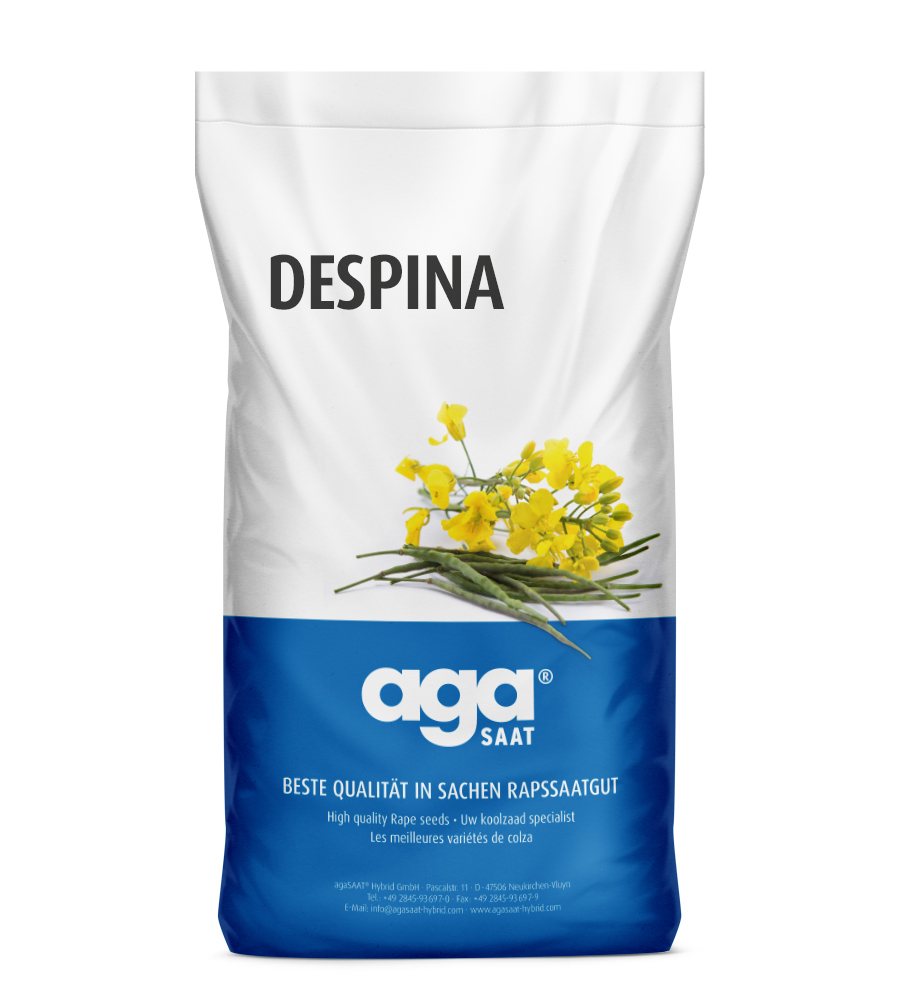 DESPINAs Ertragspotential ist erstaunlich! Vor allem der sehr hohe Kornertrag und der hohe Ölertrag überzeugen! DESPINA ist standortspezifisch anpassungsfähig und eignet sich auch für Höhenlagen sowie leichte Standorte. Vor allem die zügige Pflanzenentwicklung im Herbst und die gute bis sehr gute Winterhärte zeichnet die umweltstabile Rapssorte DESPINA aus. Zudem untermauern DESPINAs guten Resistenzeigenschaften und der mittelhohe Wuchs ihren robusten Gesamteindruck. (1,5 Mio. Körner pro Einheit)